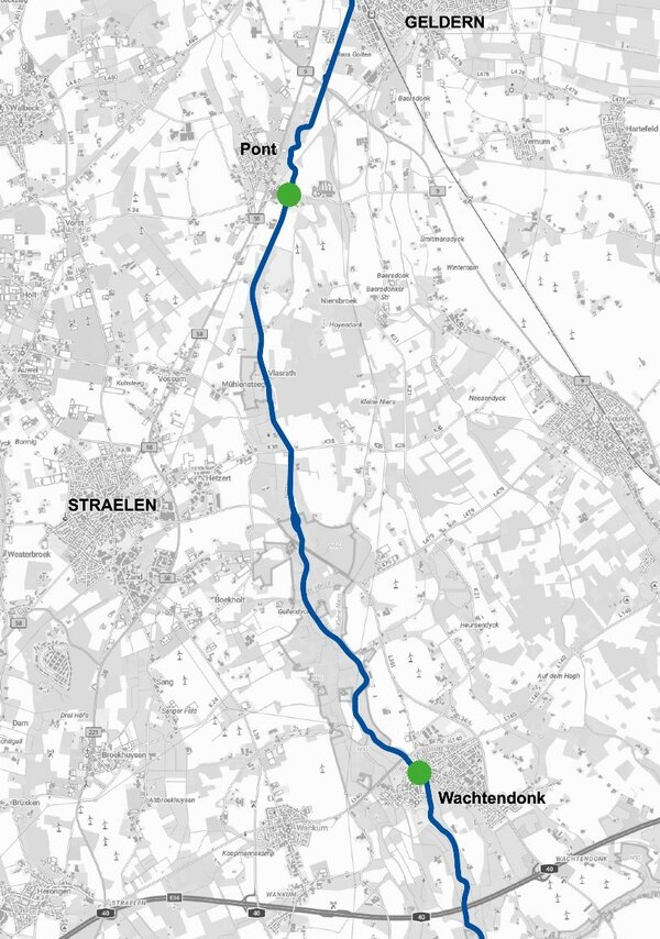 Abbildung: Die grün markierten Punkte in der Karte zeigen den Ausstieg in Wachtendonk bzw. den Einstieg hinter der Sperrung in Geldern-Pont