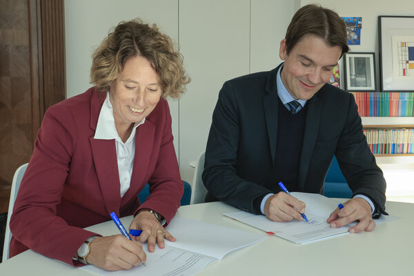 Abbildung: Sabine Brinkmann und Prof. Dr. Uli Paetzel bei der Unterszeichnung des Kooperationsvertrages (Quelle: Emschergenossenschaft)